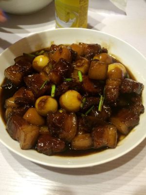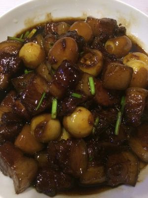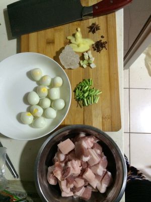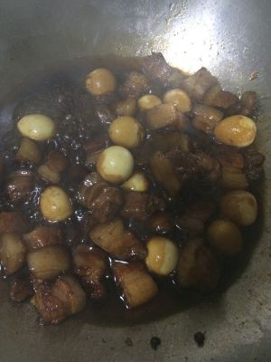 锅里留一勺油,放三勺冰糖煮至糖融化完转黄色, 再把五花肉放至锅里翻炒至五花肉上好色,接着放水没过五花肉,加入步奏3,酱油,料酒,煮半小时再放入鹌鹑蛋煮1小时至水干收汁就好。(在煮的过程中水干了记得加热开水,不能加冷 水。在这里我用的是客家黄酒)