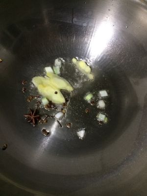 锅里倒入油 葱、姜、八角、花椒放锅里炒一下。