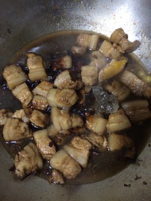 放入五花肉炒一会直到出油。然后倒入酱油、老抽、料酒、冰糖加水没过肉炖。大约30-40分钟吧。具体也没有看时间,因为要看孩子