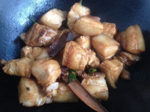 翻炒均匀,我感觉颜色有点淡,又加了一点酱油炒一下,这个颜色差不多了!哈,家常红烧肉做好了!