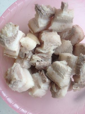 五花肉凉水下锅,加料酒半汤匙、生姜片2-3片大火煮开,再小火煮5分钟,撇去浮沫,肉捞出温水冲洗干净,厨房纸巾擦干水分,稍凉后切块3cm左右一块