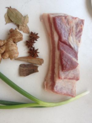 依次放入盐、糖、白酒、姜片,葱、鸡精、酱豆腐一块、大料(八角)一个,花椒适量香油少许提味,然后加水!