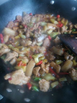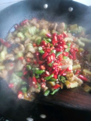 然后放入泡生姜与泡海椒,此时翻炒即可闻到泡菜的香味和肉想的混合,炒3-5mins