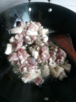 热锅倒油放四五块冰糖,熬化成红色气泡放入五花肉翻炒至五花肉中流出油份