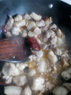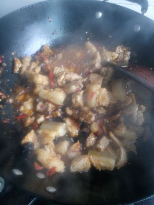 接着放入放红烧酱油、味极鲜、醋(醋是用来提鲜熟了以后不油腻)继续翻炒上色