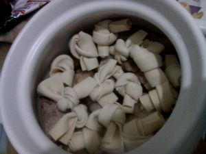 再铺一层百叶结,(我的百叶皮买少了,所以铺一层就没了,不喜欢吃的可以不放,省去这步,直接全铺肉)反正就是一层肉一层皮