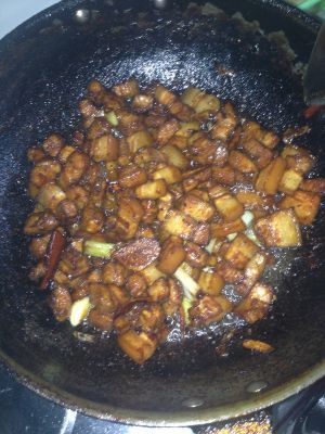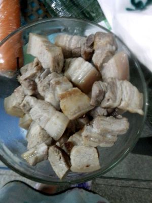 把冷水下锅煮好的肉(冷水下锅,锅里放黄酒,葱段,姜片,五花肉,水开后一分钟捞出,葱姜扔掉)用冷水冲好,水控干,另取锅,倒油,放大蒜头和葱断,炒出香味,放入五花肉,待变成微黄,取出。