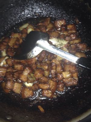 翻炒,放料酒。再炒肉全变色,放生,老抽,提闻,增色。放醋,去腥,继续炒