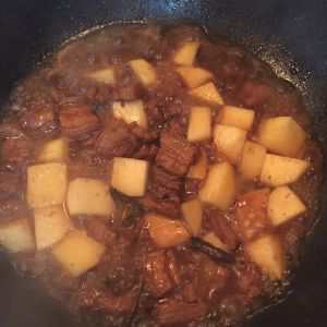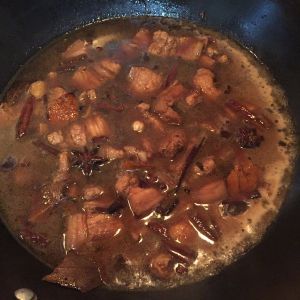 将猪油倒出,放入料酒,酱油和白糖,盖锅煮,直至汤汁变得粘稠,发亮。