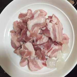 将煎好的红烧肉放至锅中,再加入适量的冰糖。进行翻炒