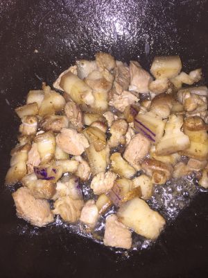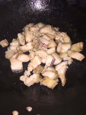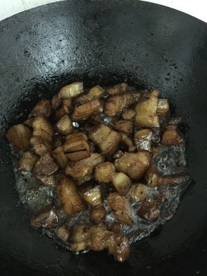 煸炒出油之后放入瘦肉,继续煸炒,若是五花肉,忽略此步骤,继续边加料酒边中小火炒,注意要多翻炒,免得粘锅,料酒要一点点加