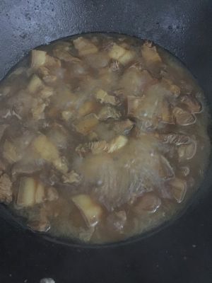 汤汁快干时,加入适量红糖或白糖调味,小火翻炒收汁,若太干,可加入料酒翻炒