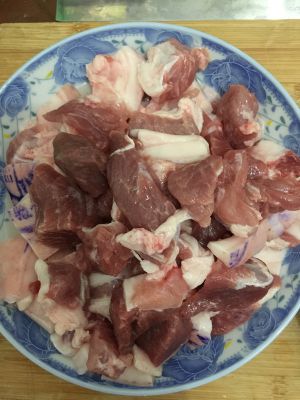 葱姜蒜切大块备用,猪肉切块焯水打去浮沫,断生后捞出备用。