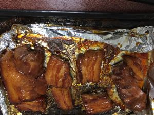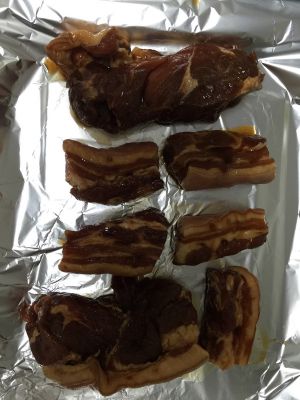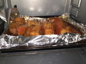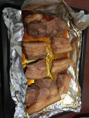 40分钟后取出,肉还没有很熟烂,打开锡纸,刷上之前的腌料酱汁,继续烤20分钟
