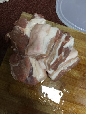 五花肉切成丁,加生抽,叉烧酱,料酒,生姜拌匀,放冰箱冷藏腌制8小时左右
