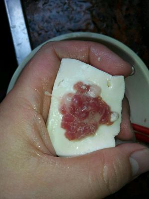 轻轻的把豆腐中间掏掉一点不要,把肉馅塞进去,小心点一定要温柔一点,肉馅要一点一点塞,豆腐才不会破