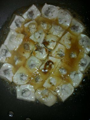 把酿好的豆腐放入八成热的油锅里煎,记得千万不要翻煸,这样豆腐容易碎;