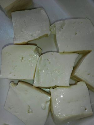 豆腐切块 用汤勺柄在豆腐块上挖小洞但是不要挖穿