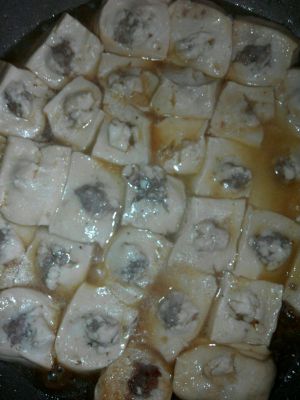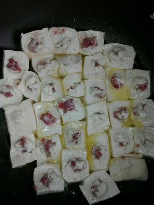 酿好以后,把豆腐放入锅内码好,洒点盐开始煎