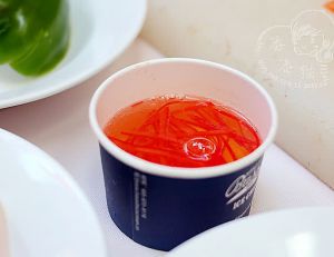 红彩椒片薄片,切细丝后用凉水泡一会儿,就打卷了,点缀在菜上也很漂亮。