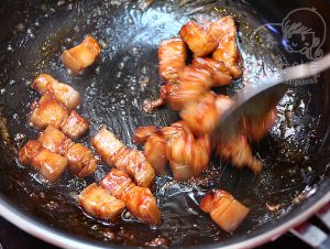 把已经焯过水的带皮五花肉下入,和糖一起翻炒。