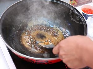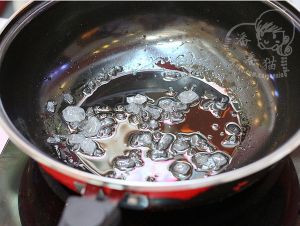 锅里不放油,放点水和冰糖,一同熬煮,炒焦糖,就是我们老百姓说的炒糖色。