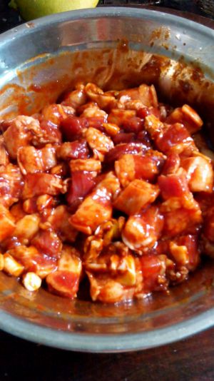 热油下姜蒜爆香,下腌好的肉翻炒出油。挤入柠檬汁。