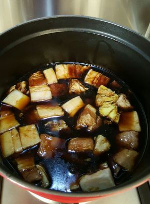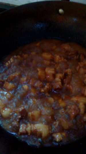 炒匀后加入水没过肉,想吃烂的就稍微多加点水,大火开锅后小火慢炖,等肉熟烂后大火收汁。