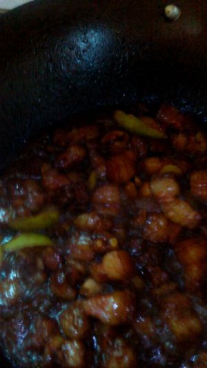 汁收的还不是很干的时候可以尝下,肉酸酸,按个人口味加入适量红糖,收好汁,把柠檬皮倒入翻炒几下出香味就可以出锅了。