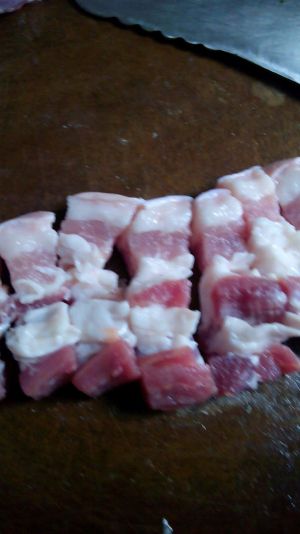 五花三层的五花肉切成小块,焯水去血沫,焯水时可以加点料酒。