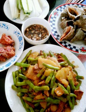食材洗干净,土豆切滚刀块,豆角中间折断,五花肉切片
