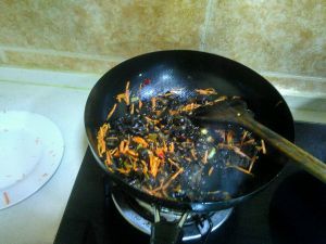 木耳提前用温水泡开,切丝;青椒切丁,胡萝卜切丝,葱姜蒜切末,野山椒切丁。
