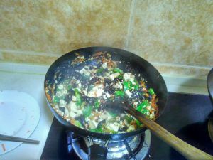 放入豆腐和青椒,加入适量盐,适量醋翻炒。