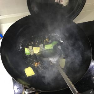 着色均匀后投入葱段.姜片及所有大料不断翻炒。