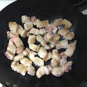 大勺内不放油,将切好的五花肉放在大勺里,小火煎出油。