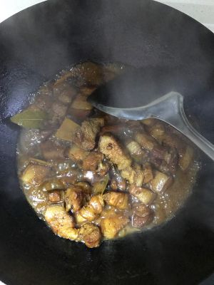 等油炒差不多时,先放糖,炒一会,,再放料酒,生抽,老抽,盐,再加水,每放一样料可以稍微。炒下的,然后再放水,大火烧开。,小火炖