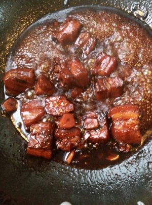 接着放入放红烧酱油、味极鲜、醋(醋是用来提鲜熟了以后不油腻)继续翻炒上色