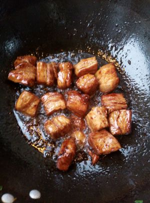 热锅倒油放四五块冰糖,熬化成红色气泡放入五花肉翻炒至五花肉中流出油份
