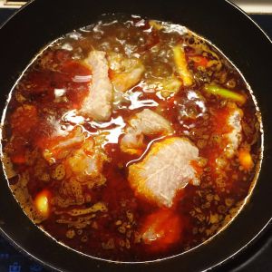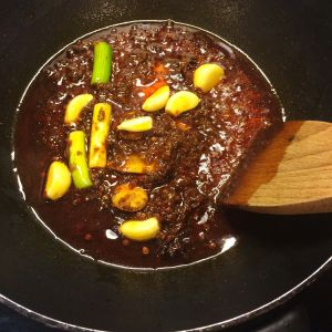 加入花生油 爆炒 葱头 姜片 蒜粒 干辣椒 花椒 然后放入芝麻炒香 加入郫县豆瓣酱 翻炒 最后加水煮开之后加入一点酱油和盐