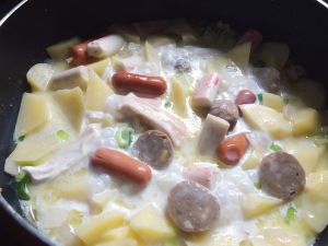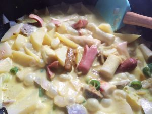 锅中放油,油热后下入姜丝,皮蛋,火腿丝。皮蛋微焦,加入水,水开后加入娃娃菜丝和自己想吃的东西,待娃娃菜软后,调入鸡精和盐。