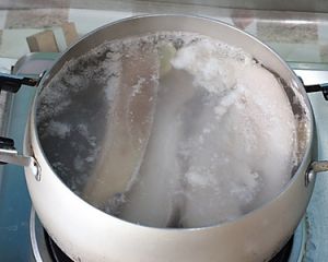 猪肉整块放进开水里煮5分钟。 为了定型。