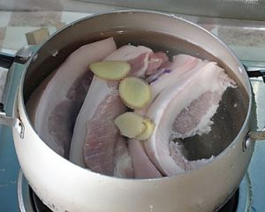 洗净的五花肉放入锅中,倒入清水,同时水中放入生姜片,可以去掉肉腥味!
