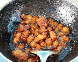 小火慢煎至冰糖焦糖色。放肉块。如怕溅油,可关火加肉。