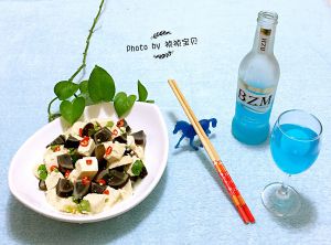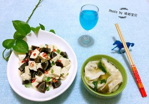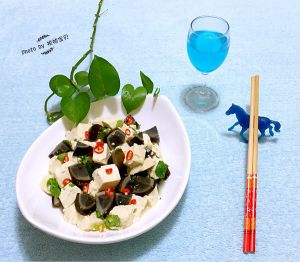 把搅拌好的辣椒和葱放在切好的皮蛋豆腐上就完成了!! 是不是超级简单! 加了辣椒粒超级好吃!