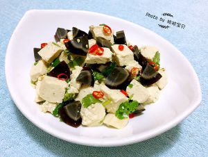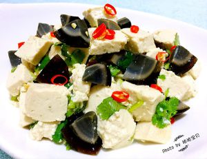 皮蛋也切成小粒(刀上沾一些水会好切一点)放在豆腐上
