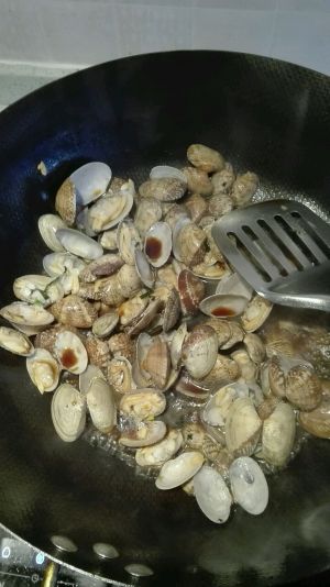 改大火,将花蛤倒入锅中翻炒。等花蛤张开口后,倒入适量黄酒,同时将锅盖盖住,焖十秒左右,打开锅盖,花蛤伴着酒香的气味就会弥漫整个厨房,非常好闻