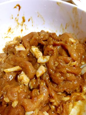 拌匀后,我是直接上手把肉和料拌匀的,然后舔舔手指头尝尝咸淡