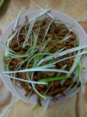 准备好大葱切丝,细丝!在准备好肉丝,最好有点肥的,更香一点!