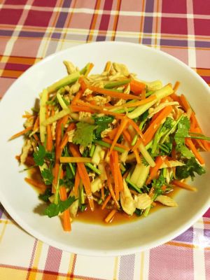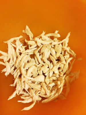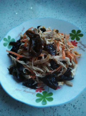 把煮熟的鸡胸撕成条状,放盘里备用!把胡萝卜切成丝,木耳切成小块和鸡丝放一起!