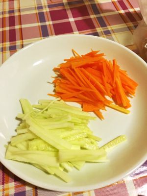 同时黄瓜胡萝卜挫丝,所有调料根据口味拌一碗凉拌汁